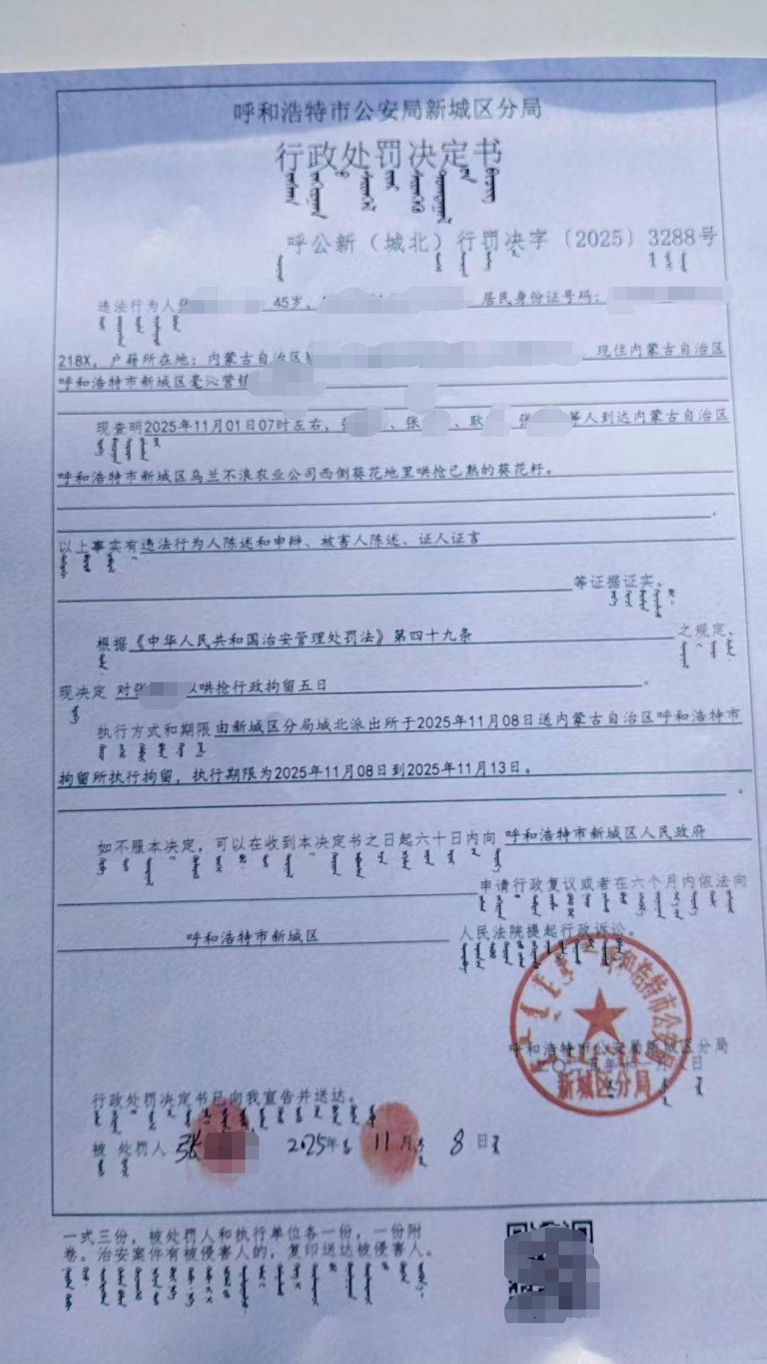 李先生提供的警方行政处罚决定书显示,查明11月1日7时左右,张某4人等到涉事葵花地哄抢已熟的葵花籽。对张某等以哄抢行政拘留5日。“这4人已被拘留,其他的还在调查。”李先生说。